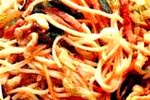 ټولو ته معلومه ده چه د اوړه په واسطه جوړ شوي رشته د ډيرو خلکو له عمده و خوراکونو څخه ده ٠ دغه ډول خوراک په چين کې خصوصأ د چين په شمالي سيمه کې د ډيرو خلکو د ډوډۍ پر ميز باندې مهم ځاي لري ٠ د رشته جوړ شوي خوراکونه هم بيلا بيل دي ، مثلأ د ښوروا رشته ، د سبزي رشته ، د غوښو رشته او داسي نور ٠ دلته د غوښو رشته جوړونه په دي ډول ده ٠ لومړي نيم کيلو خام رشته ، دوه سره بانجان ، يو غټ پياز ، څو داني اوږه ، دوه سوه ګرامه پخول شوي د چرګ غوښه ، لږ څه شين رنګ سبزي چه په خپله خوښه ټاکل کيږي .، برابر سوس ، غوړي او مالګه تيار کړي ٠ وروسته نرم تار رشته په ديګ کې واچوي او تر ممکنه حده پوري يي جلا جلا کړۍ او د بخار په واسطه يي پخه کړۍ ، رشته چه پخه شي ، په يو سامان کې واچوي او رشته يخه کړۍ ، که رشته اوږده ده ، کيداي شي چه له پنځو ساتنې مترو نه تر لس ساتنې مترو پوري قطع کړۍ ٠ بيا به پخول شوي د چرګ غوښه په نرم تار پري کړي ، غټ پياز د تار شکل پوري کړۍ، شين رنګ سبزې هم په تار پري کړۍ ، د سوربانجن پوستکي وباسي او ټوټه ټوټه يي کړۍ، اوږه ميده ميده کړۍ٠ وروسته په يو ديګ کې برابر غوړي پکې واچوي او ديګ د اور د پاسه کيږدۍ ، غوړي چه سري شي ، د چرګ غوښه او سبزې سره يو ځاي پکې واچوي او برابره مالګه ور زيات کړۍ٠ يو يا دوه دقيقي نه وروسته به يي له ديګ څخه راوباسي او په يو بل سامان کې واچوي ٠ له دي نه وروسته په يو بل ديګ کې برابر غوړي پکې واچوي او ديګ د اور د پاسه کيږدۍ ، غوړي چه سري شي ، نوموړي غټ پياز پکې واچوي ، لږ شيبه وروسته سوبانجن پکې واچوي او ويي لړۍ ، سربانجن چه په غوړي کې نرم شي ، برا بر سوس ، مالګه ، ميده شوي اوږه او نوموړي رشته سره يو ځاي پکې واچوي او ورو ورو ويي لړۍ او په عين وخت کې لږ څه اوبه هم ورزيات کړۍ، خو يو وار زيات اوبه په کار نه دي څو چه رشته ډير نرم نه شي ، ور پسي تيار شوي د چرګ غوښه او سبزې هم ور سره يو خاي ولړۍ ، کله چه موجود اوبه د رشته له خوا اخيستل شوي او رشته هم ډير نرمه او کلکه نه وي ، نو دغه خوراک تيار شو ٠ دلته د توجه وړ خبره دا ده چه د اوبو اندازه بايد تر ښه کنترول لاندې راشي ٠ که رشته کلک وي ، کيداي شي چه په دوو وارو لږ څه اوبه واچوي ، خو يو وار زيات اوبه وا نچوي ٠